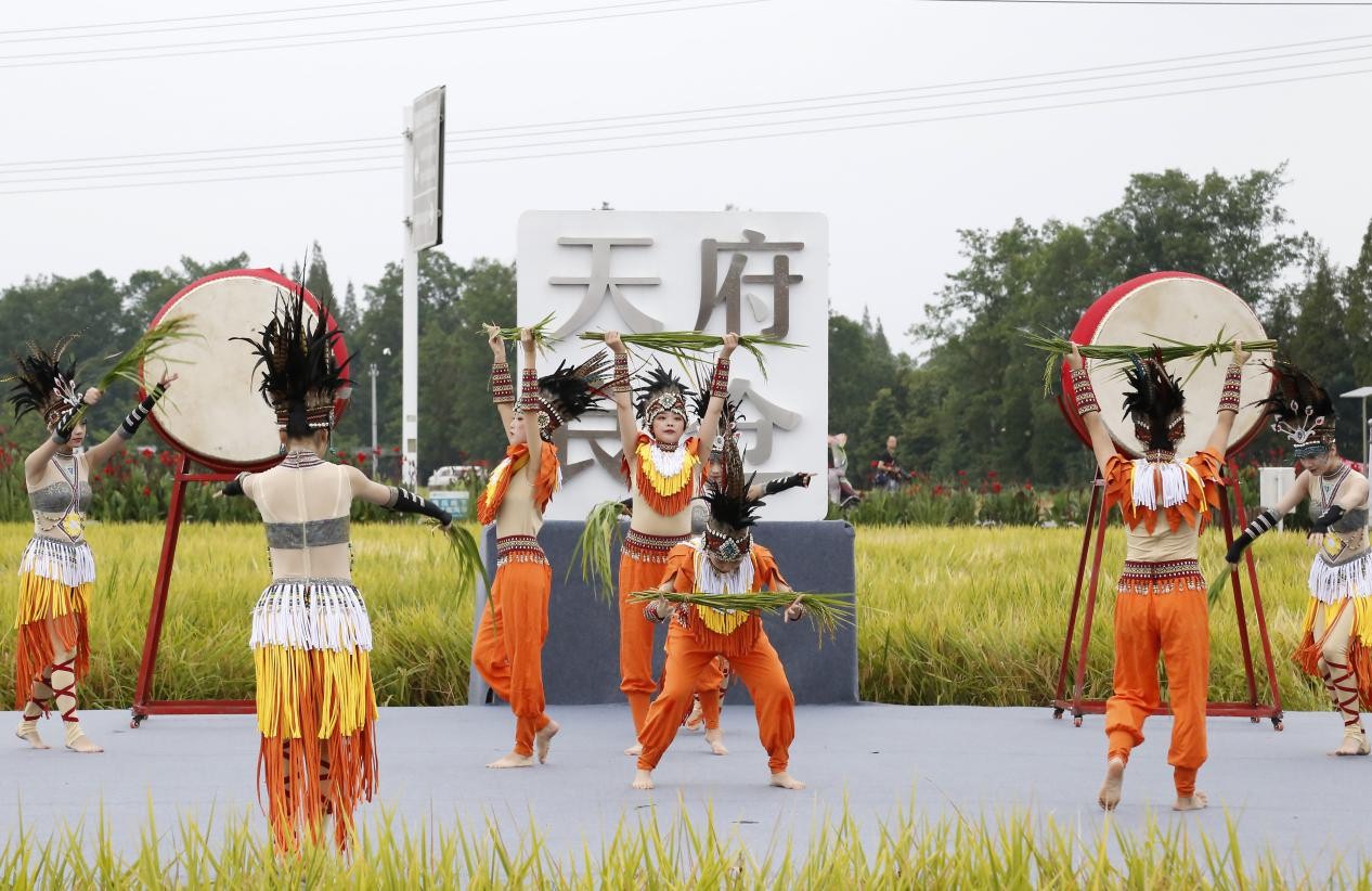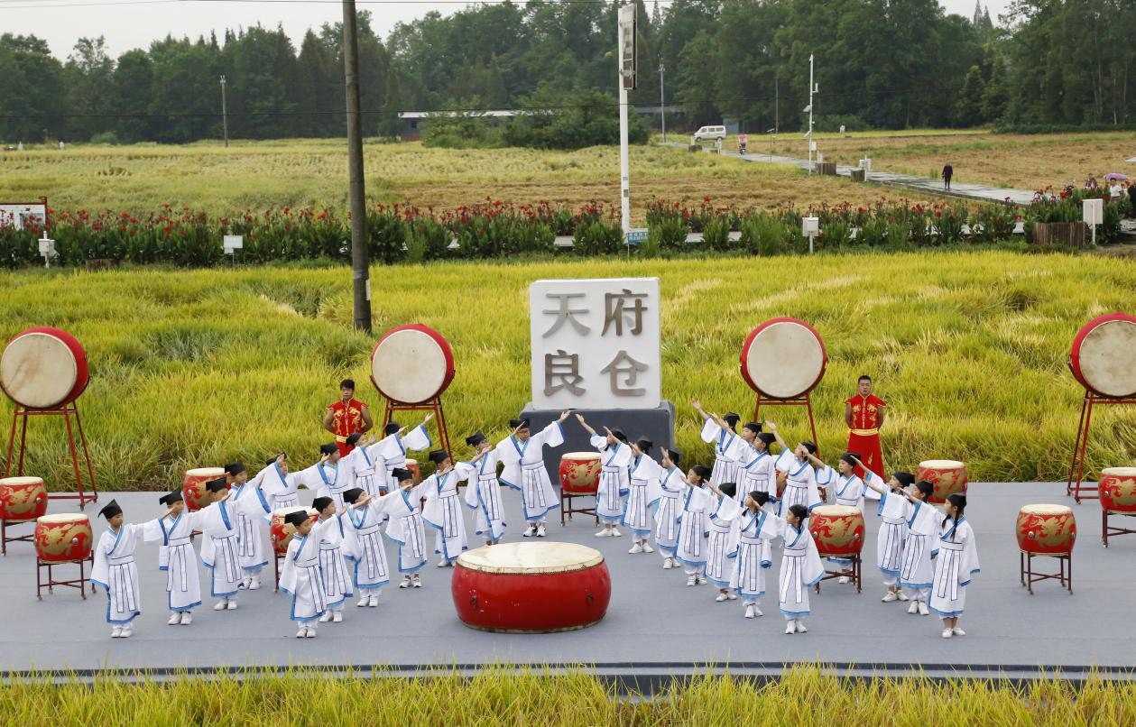 活動(dòng)現(xiàn)場(chǎng),隨著一曲精彩的《鼓上舞》上場(chǎng),身著白色漢服的小演員們高呼“開鐮了!”歡快的童聲撒向了舞臺(tái)周圍金燦燦的稻田地,現(xiàn)場(chǎng)10太收割機(jī)同時(shí)啟動(dòng),拉開了活動(dòng)序幕。崇州市政府副市長(zhǎng)文國(guó)洪、市委辦公室主任廖慶發(fā)表了致辭。隨后崇州市政府相關(guān)領(lǐng)導(dǎo)及集團(tuán)副總裁楊開榮上臺(tái)開鐮,割下新一季的水稻,放入印有“豐”字的竹筐中,寓意“五谷豐登”。