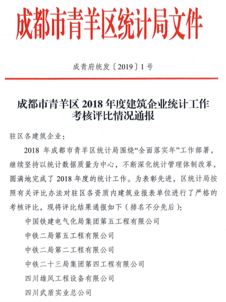 集團(tuán)公司、華途公司、華霆公司統(tǒng)計工作獲青羊區(qū)統(tǒng)計局表彰
