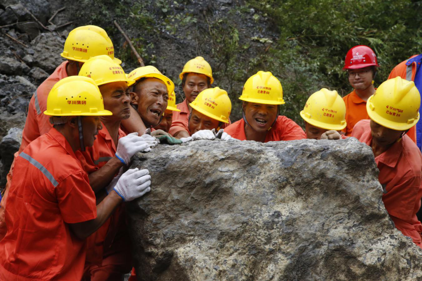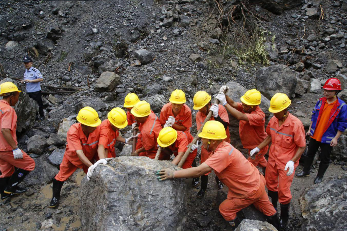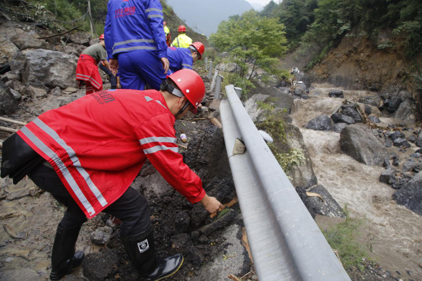 集團應(yīng)急搶險隊伍清理滑坡巖石