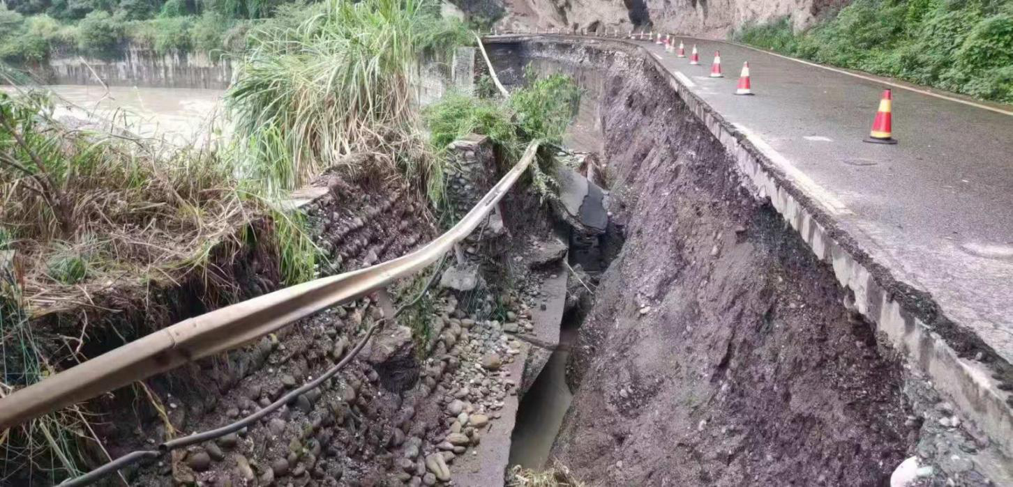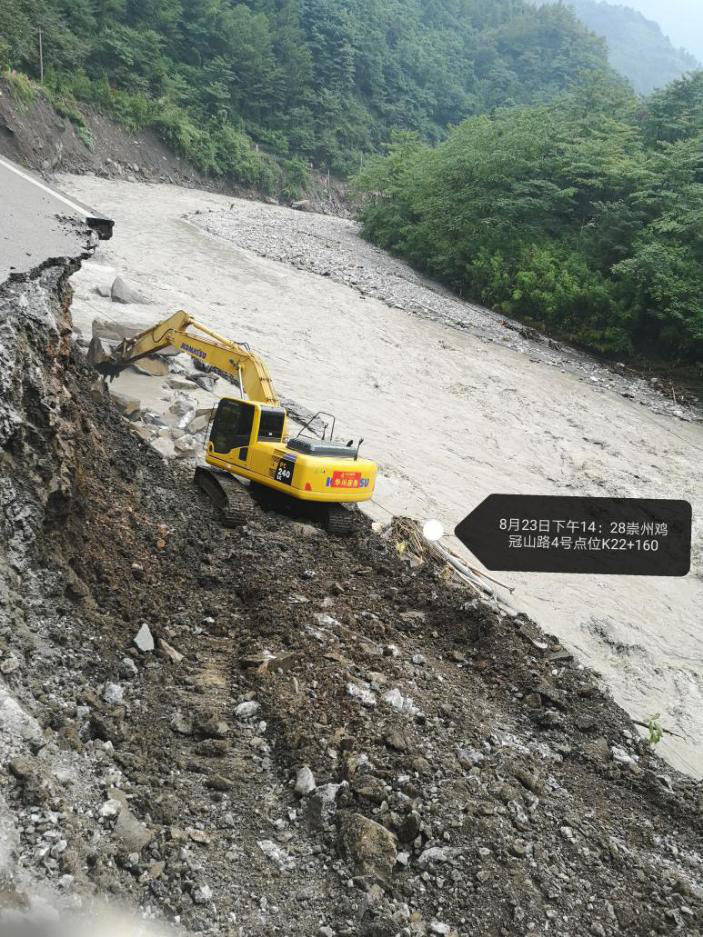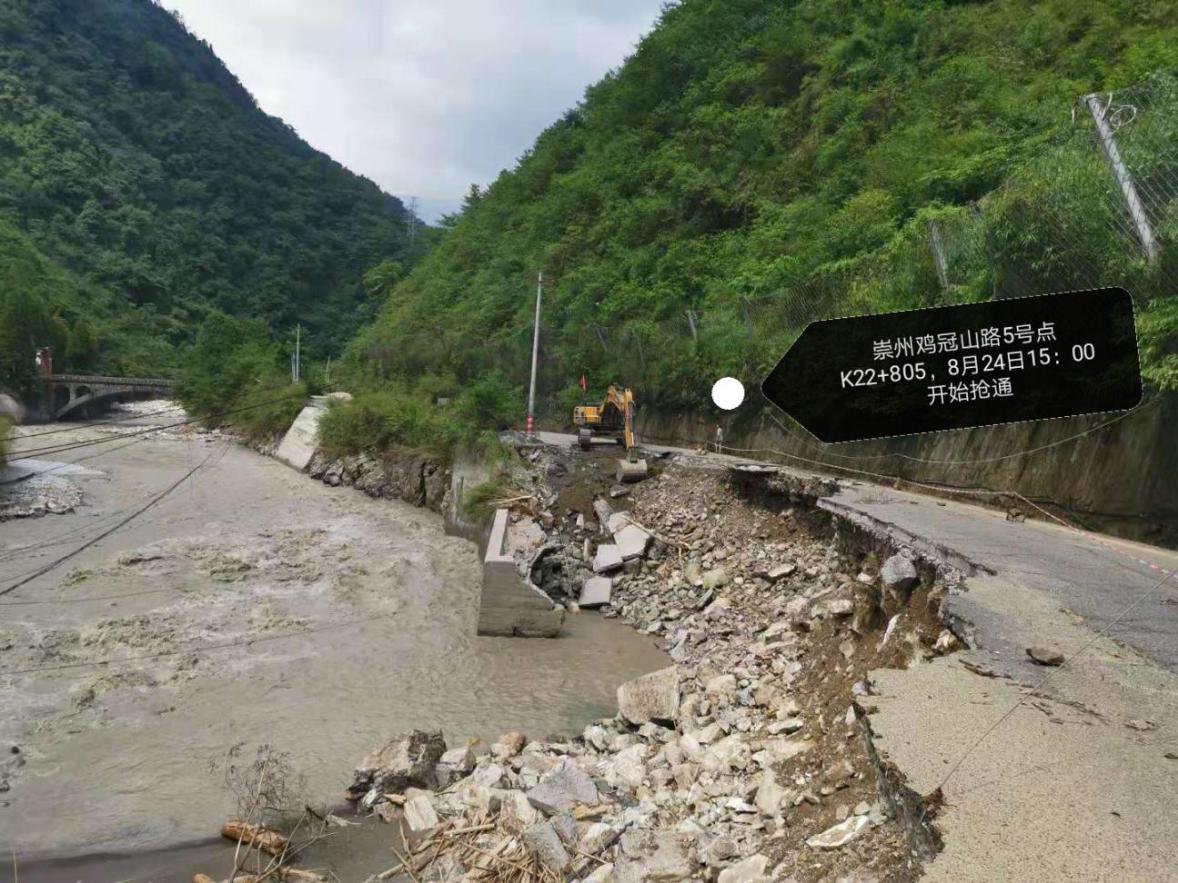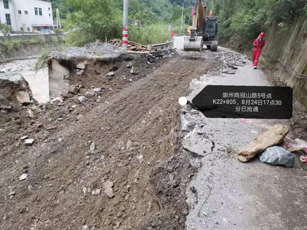 崇州市雞冠山路全長近42公里,受此次強降雨影響,已探明其中31公里路段有24處斷點,其中5處路基沖毀嚴重,有的路段半幅路基路面被山洪沖垮,有的路段路面懸空,有的路段全部被洪水沖毀。