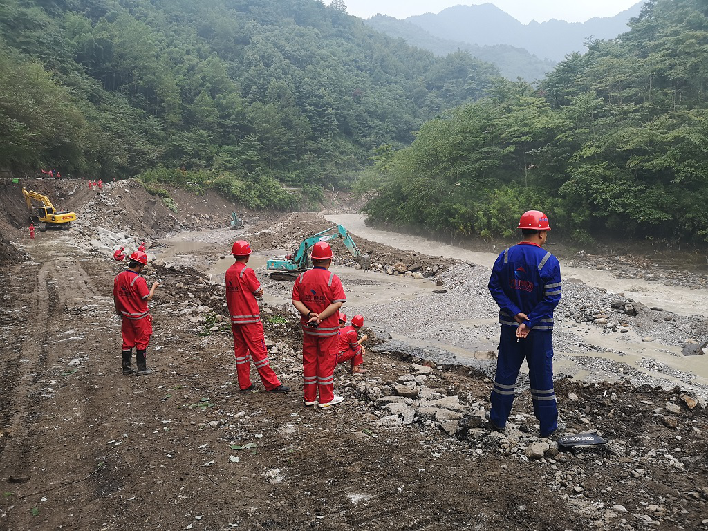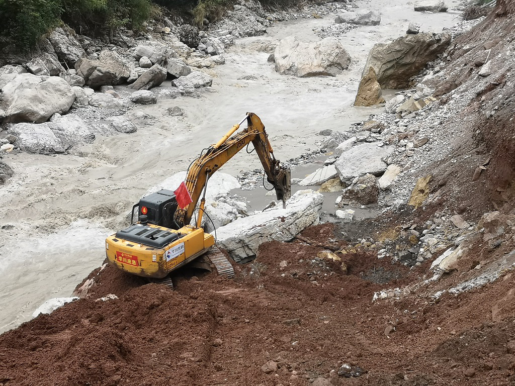 截止8月26日,崇州雞冠山受災(zāi)路段4號點位(K22+260)及5號點位(K22+805)已全面搶通,達到機械設(shè)備、車輛可以通過條件。同時,為增強兩處通行能力,分別在4號點位采取鉛絲籠加固便道及邊坡,5號點位對路基進行填筑加高。26日下午,11號點位(K25+390)已組織機械設(shè)備進場進行便道路基修筑。