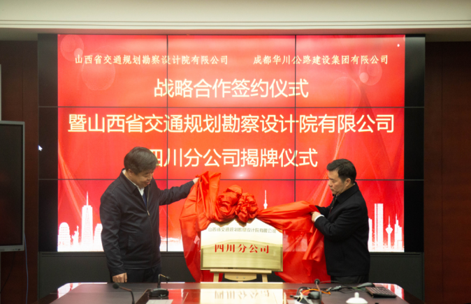 簽約儀式后,舉行山西省交通規(guī)劃勘察設(shè)計(jì)院有限公司四川分公司揭牌儀式,集團(tuán)董事長(zhǎng)、總經(jīng)理、黨委書(shū)記謝應(yīng)文受邀揭牌。